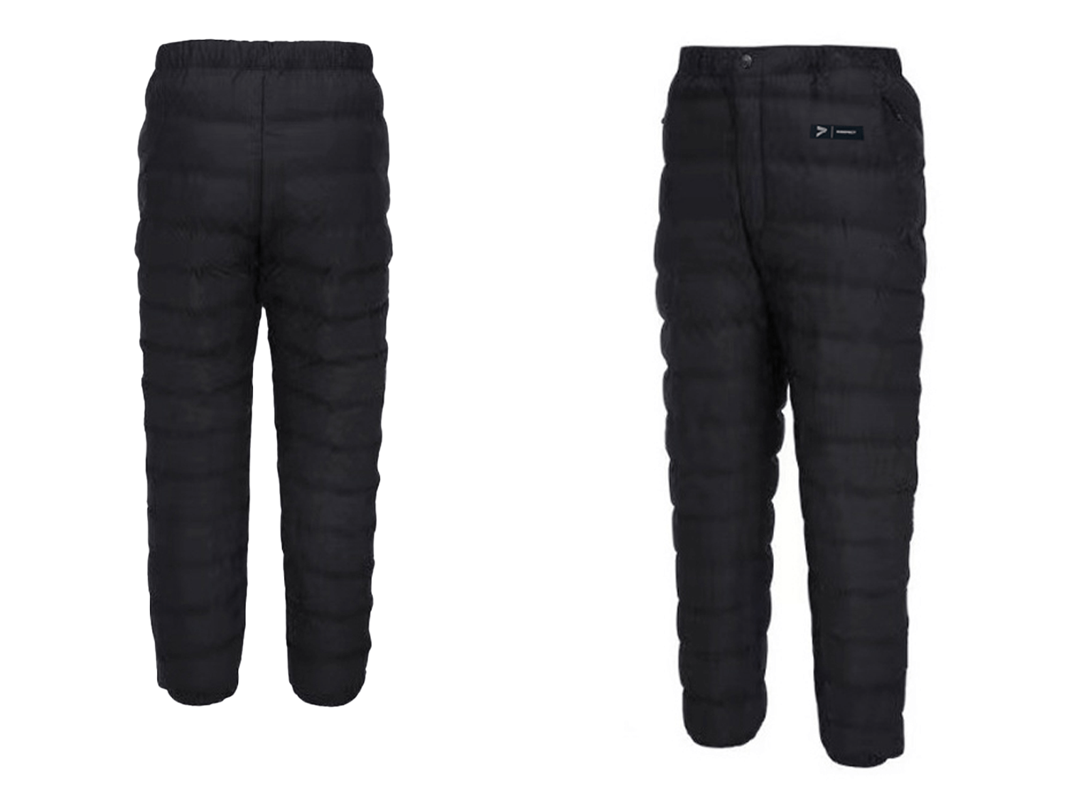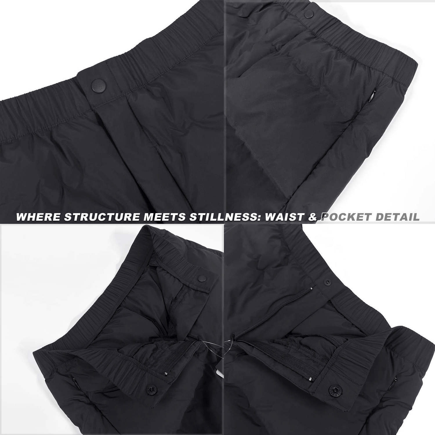 Filled with high-quality white duck down (80%) and encased in a durable nylon/cotton shell, these Matte black athletic down pants offer lightweight warmth and wind resistance without compromising comfort.