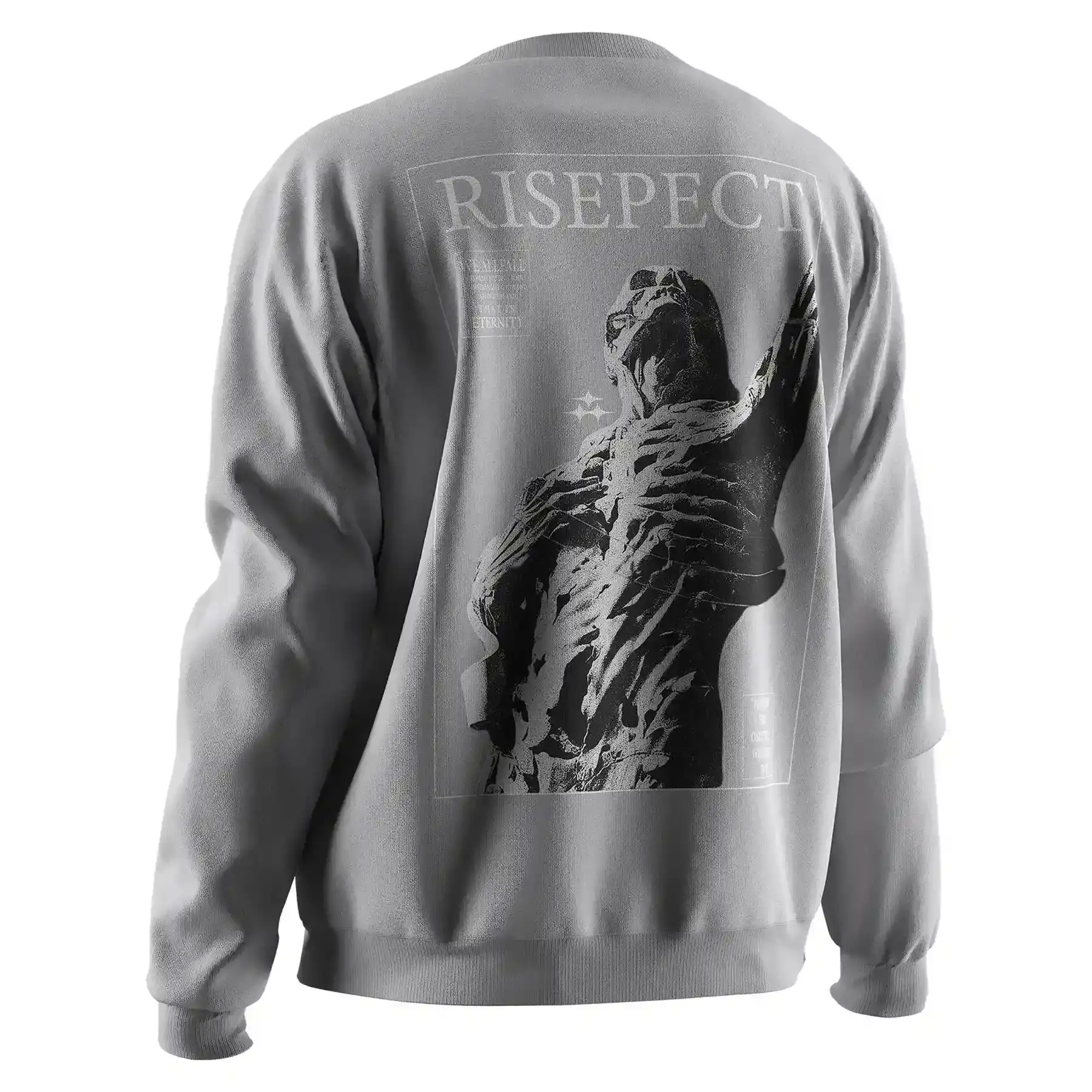 The sweatshirt features a clean, solid-color front accented with a subtle brand text logo, while the back showcases a bold, full-size sublimation graphic inspired by combat culture—such as MMA tributes, warrior skull sculptures, ghost hands, or belt-holding champions standing over defeated opponents.