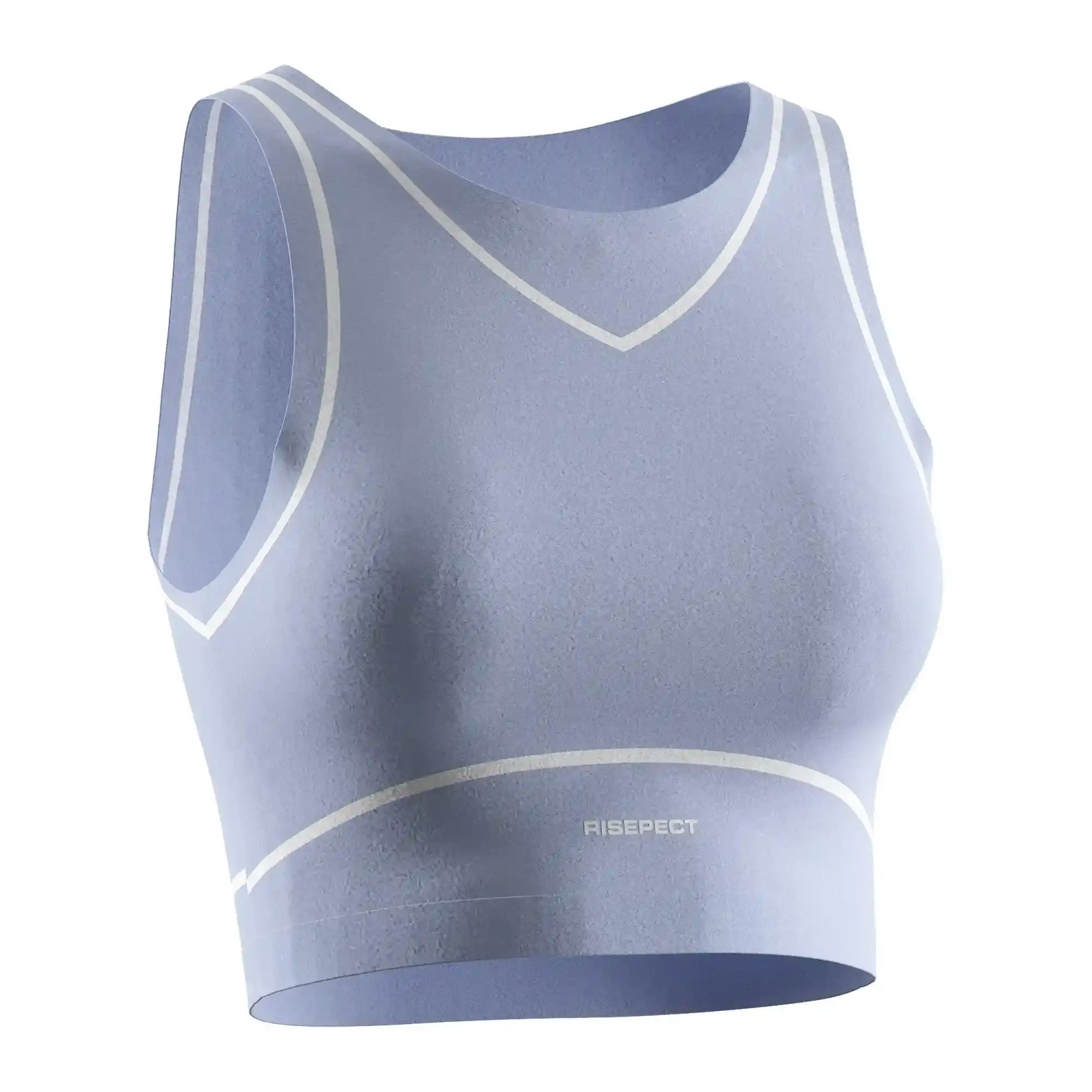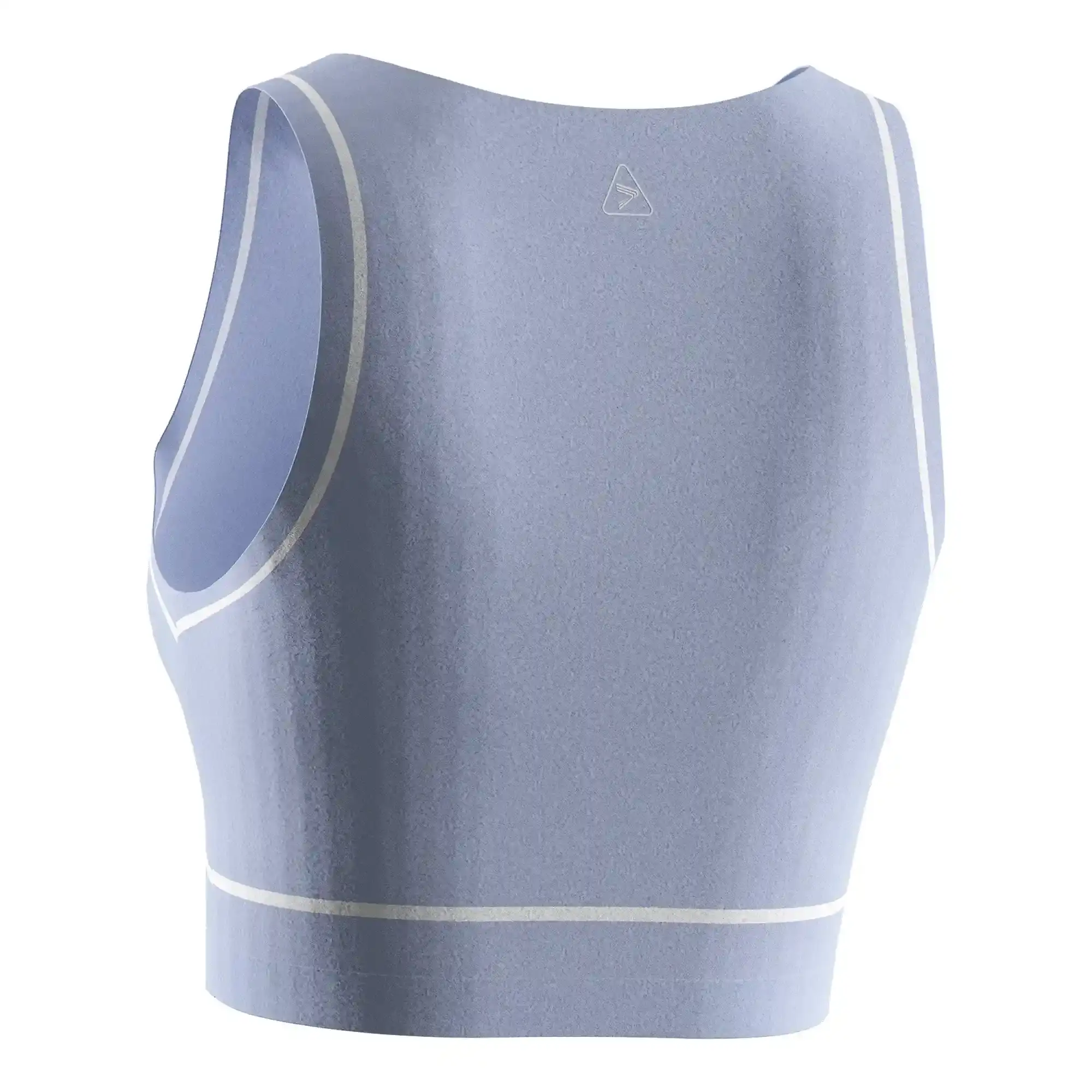 This women's sleeveless crop compression shirt is designed for performance training, running, yoga, and activewear collections. The tight-fitting cropped silhouette enhances the female shape while delivering excellent stretch and support.