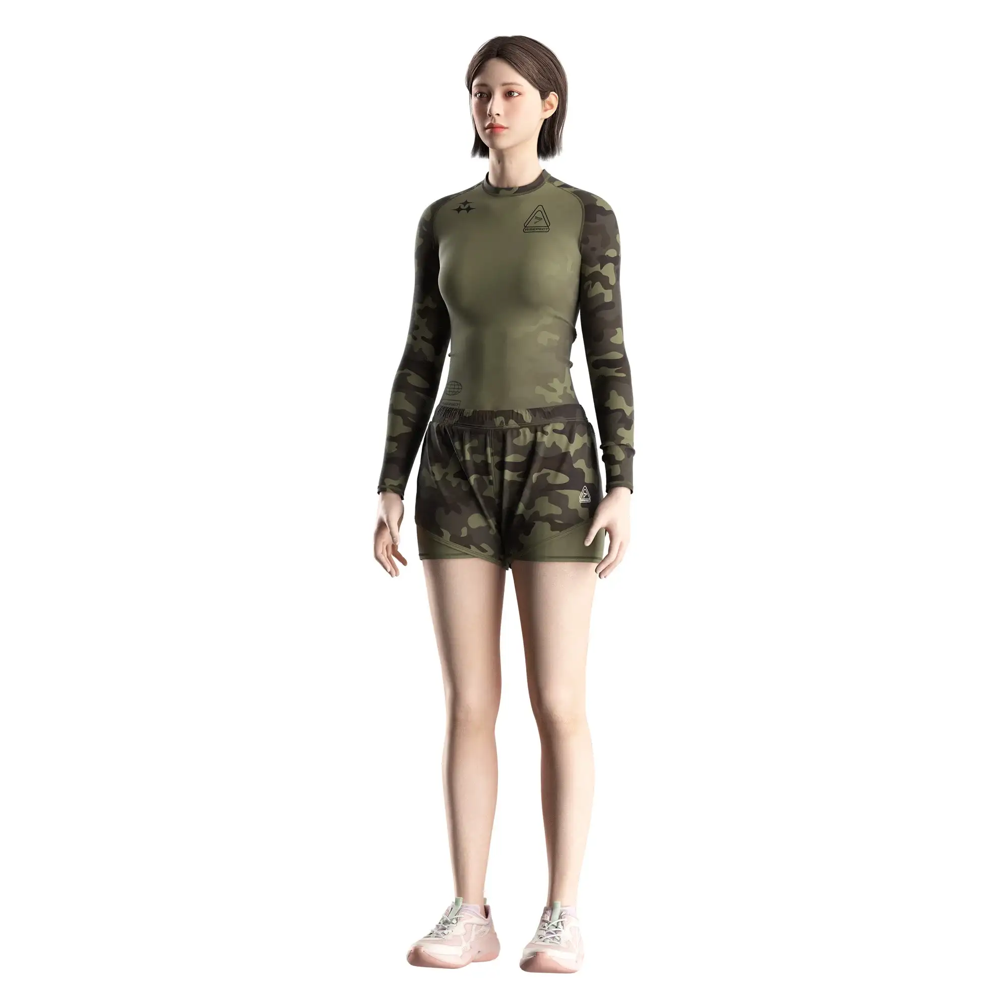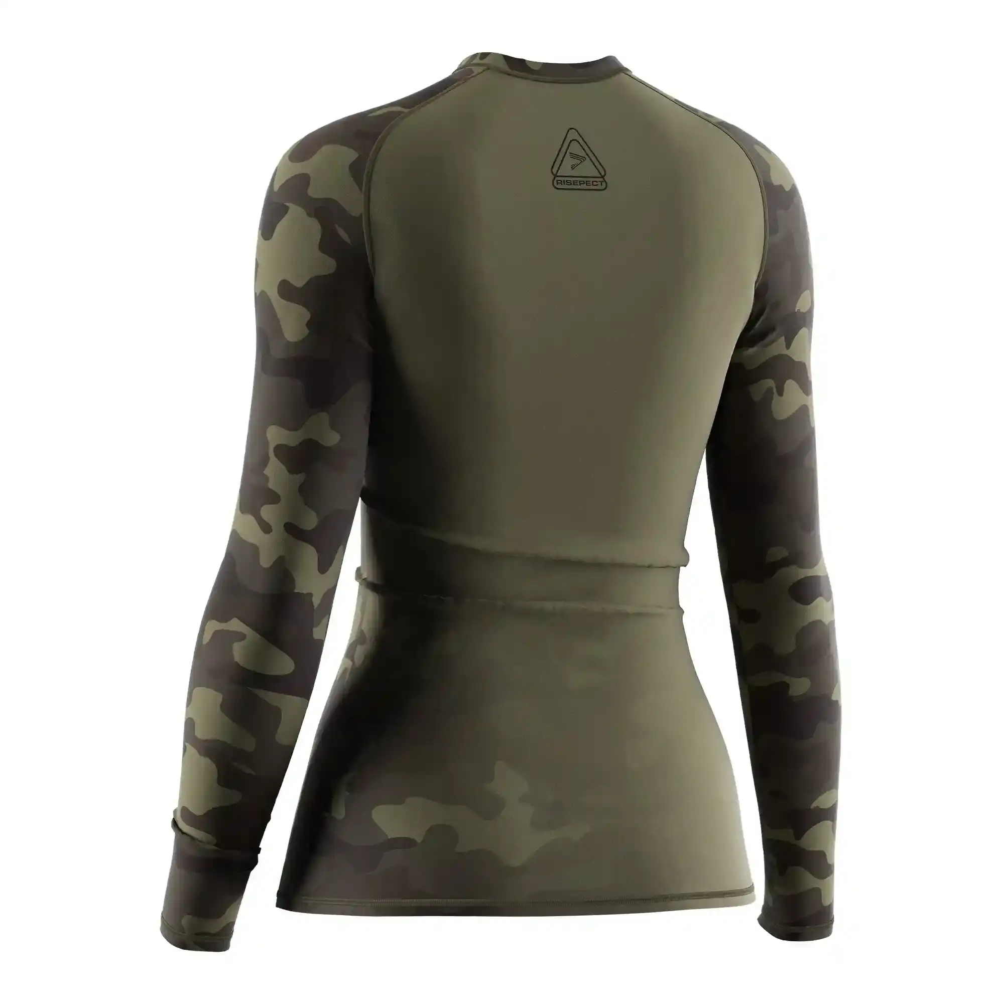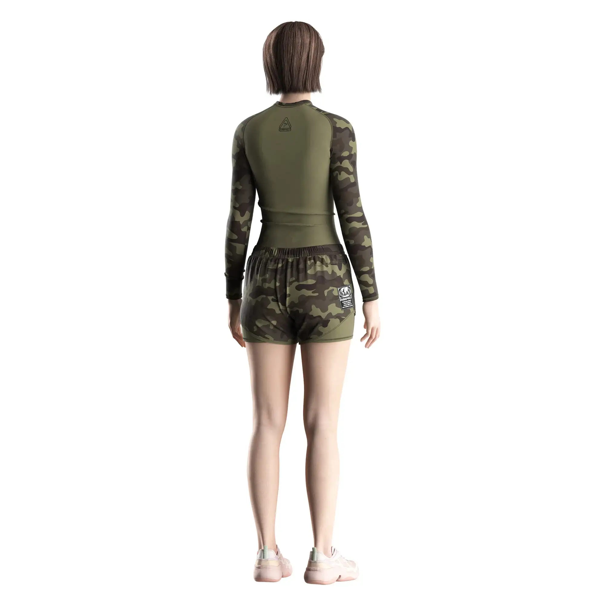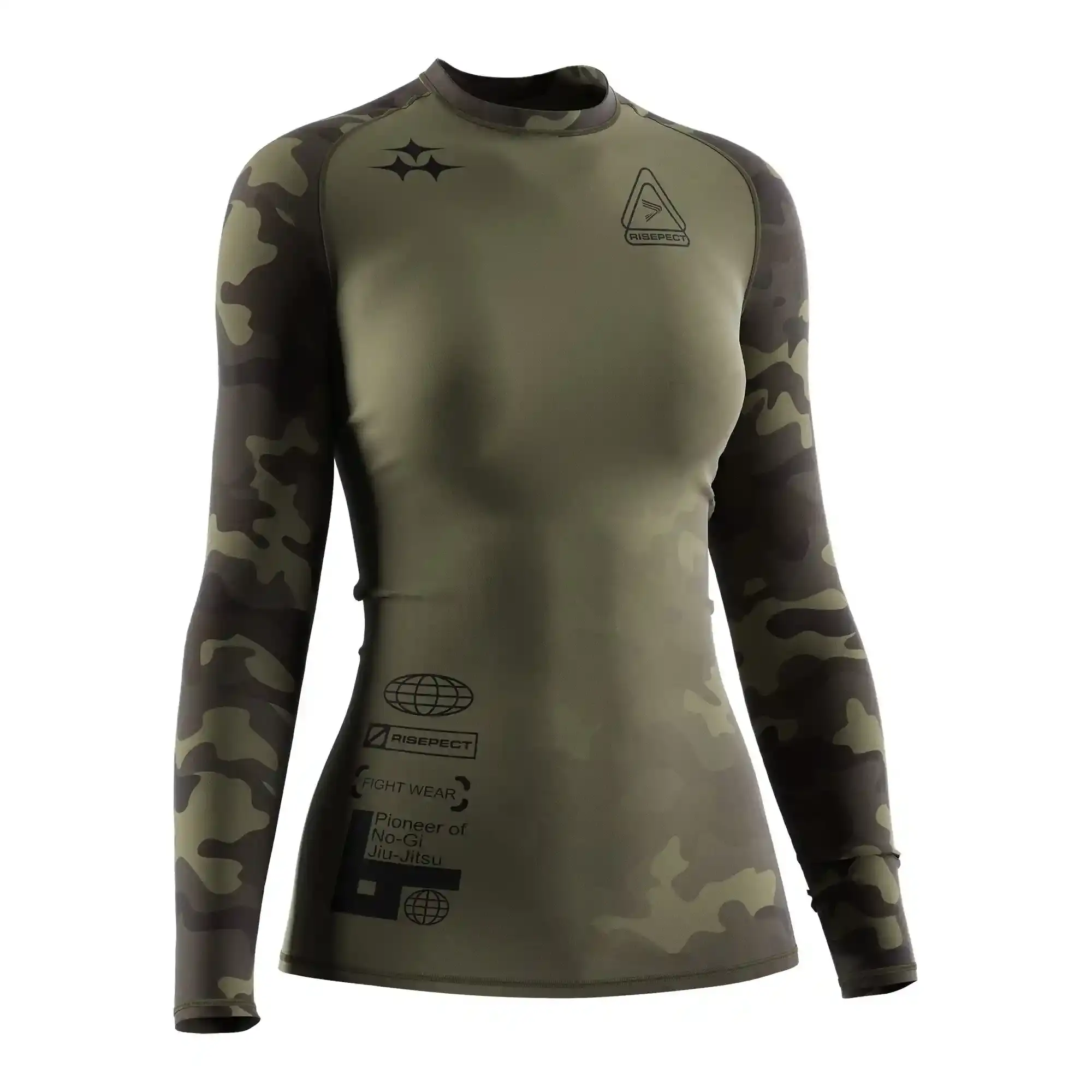 Designed for performance fightwear brands, academies, and distributors, this women's long sleeve BJJ rash guard 1.0 combines olive camouflage-pattern visuals with competition-level construction.